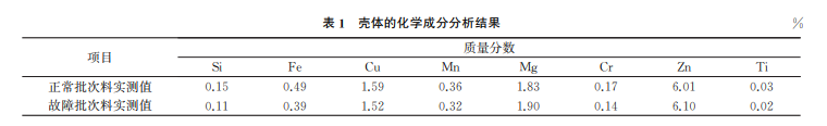 對故障批次殼體、正常批次殼體材料分別進行 化學(xué)成分分析,結(jié)果表明:殼體材料均為7A04鋁合 金,符合 GJB2054A—2018《航空航天用鋁合金棒 材規(guī)范》的要求,結(jié)果如表1所示。