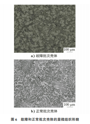 分別從故障殼體裂紋附近及正常批次殼體上 截取金相試樣,分別在光學(xué)顯微鏡下觀察,結(jié)果如 圖6所示。由圖6可知:故障批次殼體材料為再 結(jié)晶等軸晶組織,正常批次殼體材料為枝晶網(wǎng)狀 晶界組織。兩者均為α(Al)基體上彌散分布有η (MgZn2)相,沿 晶 界 分 布 有 S(Al2CuMg)相、T (Al2Mg3Zn3)相等。