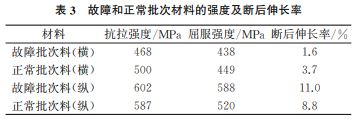 取正常批次材料和故障批次材料,按照 GB/T 228.1—2010《金屬材料拉伸試驗 第1部分:室溫試 驗方法》進行縱橫向抗拉強度、屈服強度及斷后伸長率對比分析,結(jié)果如表3所示。由表3可知:故障批 次料橫向強度及斷后伸長率性能低于正常批次料, 故障批次料的橫向抗拉強度低6.4%,橫向屈服強 度低2.4%,橫向斷后伸長率低56.8%;故障批次料 縱向強度及斷后伸長率性能高于正常批次料,故障 批次料的縱向抗拉強度高2.6%,縱向屈服強度高 13.1%,縱向斷后伸長率高25.0%。