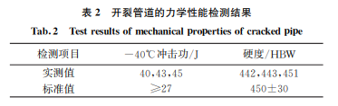 按照GB/T231.1-2009《金屬材料 布氏硬度試 驗(yàn) 第1部分:試驗(yàn)方法》和GB/T229-2007《金屬材 料夏比擺錘沖擊試驗(yàn)方法》,從管道裂紋附近區(qū)域取 樣,進(jìn)行布氏硬度試驗(yàn)和沖擊試驗(yàn)。由表2可知,開 裂管道的沖擊韌性和硬度均滿足標(biāo)準(zhǔn)的技術(shù)要求。
