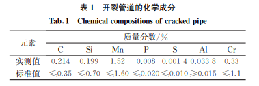 根據(jù)ASTME1019-11《不同燃燒和熔融技術(shù)測 定鋼、鐵、鎳、鈷合金中碳、硫、氮、氧合量的標(biāo)準(zhǔn)試驗(yàn) 方法》和JISG1253-2002《鋼鐵火花放電原子發(fā)射 光譜分析法》,對開裂管道進(jìn)行化學(xué)成分分析,在國 家認(rèn)可的鋼鐵材料測試中心進(jìn)行檢測。由表1可 知,開裂管道的化學(xué)成分滿足標(biāo)準(zhǔn)的技術(shù)要求。