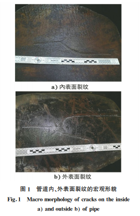 管道內(nèi)、外表面裂紋的宏觀形貌如圖1所示。由 圖1可見:管道內(nèi)表面裂紋長度約為280mm,兩條主 裂紋尚未完全斷開;管道外表面的裂紋整體上呈叉子狀,長度約為360mm。從內(nèi)外裂紋長度可以判斷管 道是從外表面起裂,并逐漸向內(nèi)表面擴(kuò)展的。