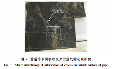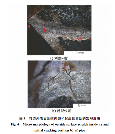 在體視顯微鏡下觀察管道外表面裂紋交叉位置 處的宏觀形貌。由圖3可見,管道外表面有兩道較 為明顯的劃痕一直延伸到裂紋交叉位置,劃痕深度 超過0.3mm,最深達(dá)0.75mm。由圖4可見:劃痕 內(nèi)部存在大量肉眼可見的垂直于劃痕的裂紋,開裂 面上有明顯的起裂痕跡,裂紋表面可見明顯的起源 區(qū)、霧化區(qū)和擴(kuò)展區(qū),可以確定該處為裂紋起裂位 置,表明管道開裂與貫穿該處的劃痕有關(guān);另外,裂 紋表面可見與裂紋擴(kuò)展方向平行的臺階狀和山脊?fàn)?凸起,并呈放射狀分布。