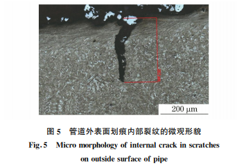 從圖3所示劃痕位置取樣,觀察劃痕內(nèi)部裂紋 的微觀形貌。由圖5可見,劃痕內(nèi)部微裂紋深度約 為270μm,劃痕表層存在明顯的形變特征,表明在 外力作用下劃痕處發(fā)生了劇烈的變形。在叉車起運(yùn) 過程中管道容易受到叉車臂的碰撞、摩擦,在組裝、 吊運(yùn)過程中管道也容易發(fā)生撞擊。當(dāng)外力強(qiáng)度超過 了材料的屈服極限時,管道表面會形成較深的劃痕 并產(chǎn)生局部應(yīng)力集中,進(jìn)而形成許多微裂紋。