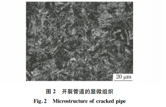 從管道裂紋附近處取樣,經(jīng)鑲嵌、研磨后,用 4%(質(zhì)量分?jǐn)?shù))硝酸酒精浸蝕,采用光學(xué)顯微鏡進(jìn)行 觀察。由圖2可見,管道基體組織為正常的低溫回 火馬氏體組織。