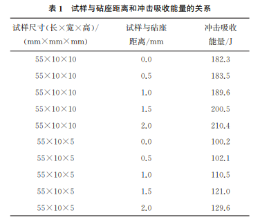 試樣缺口面應(yīng)該與砧座面緊密貼合,沖擊刀刃 沿著缺口對(duì)面向缺口背面打擊,試樣缺口對(duì)稱面偏 離兩砧座間的中點(diǎn)距離應(yīng)不大于0.5mm,否則擺錘 高速打擊試樣時(shí)會(huì)產(chǎn)生緩沖,造成沖擊試驗(yàn)結(jié)果失 真,試樣與砧座距離和沖擊吸收能量的關(guān)系如表1 所示。