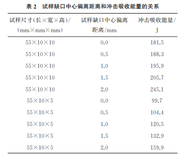 試樣缺口中心需與沖擊刀刃中心重合,否則缺 口處裂紋的形成及擴(kuò)展會(huì)變得困難,造成沖擊試驗(yàn) 結(jié)果失真[7],試樣缺口中心偏離距離和沖擊吸收能 量的關(guān)系如表2所示。
