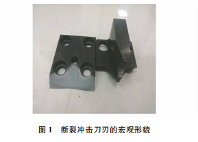 沖擊性能是指材料抵抗沖擊載荷的能力,在材 料力學(xué)性能的研究中具有重要意義。沖擊試驗(yàn)機(jī)是 用來(lái)測(cè)試材料沖擊韌性的設(shè)備,由機(jī)座、機(jī)架、擺錘、 沖擊刀刃、操作機(jī)構(gòu)和讀數(shù)裝置等6個(gè)部分組成,根 據(jù)需要還可增加一些輔助設(shè)備,如高低溫裝置、試樣 自動(dòng)對(duì)中裝置等。目前,許多機(jī)械結(jié)構(gòu)的設(shè)計(jì)都向 著輕量化方向發(fā)展,這就要求材料具有較高的強(qiáng)度 和硬度,以及良好的塑形和韌性,該類型的材料進(jìn)行 沖擊試驗(yàn)時(shí),會(huì)對(duì)沖擊試驗(yàn)機(jī)造成一定的損壞,尤其 會(huì)使沖擊刀刃的使用壽命大大縮短,甚至出現(xiàn)沖擊 刀刃斷裂的現(xiàn)象,典型斷裂沖擊刀刃的宏觀形貌如 圖1所示。筆者對(duì)沖擊試樣、沖擊刀刃、沖擊試驗(yàn)機(jī) 的選擇以及試驗(yàn)過(guò)程等方面進(jìn)行了研究,查明了沖 擊刀刃斷裂的原因,提出了合適的控制方法,以避免 該類問(wèn)題再次發(fā)生。