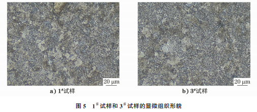 對硬度不滿足要求的螺帽(1# 試樣和3# 試樣) 進行金相檢驗,結(jié)果如圖5所示,可知螺帽的顯微組 織為回火索氏體+少量上貝氏體[2]。說明第一次熱 處理過程中,45鋼經(jīng)完全奧氏體化后,未完全形成 馬氏體,而形成了少量上貝氏體組織,從而導(dǎo)致回火 后硬度較小。