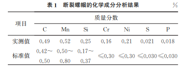 對數(shù)控車斷裂螺帽取樣進行化學(xué)成分分析,結(jié) 果如表1所示,可見螺帽的主要化學(xué)成分滿足 GJB 1951—94《航空用優(yōu)質(zhì)結(jié)構(gòu)鋼棒規(guī)范》對45鋼的 要求。