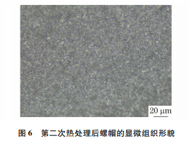 第二次熱處理后螺帽的硬度測試結(jié)果如表4所示,可見螺帽的硬度均勻,且均滿足 GB/T1172- 1999的要求。對第二次熱處理后的螺帽進行金相 檢驗,結(jié)果如圖6所示,可見螺帽的顯微組織為回火 索氏體,未見上貝氏體等非馬氏體組織。