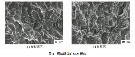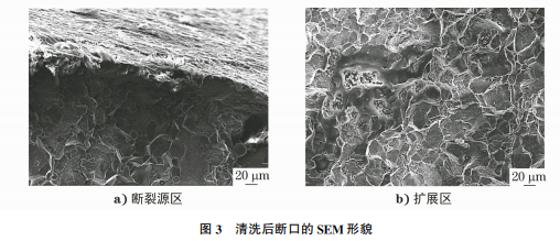 將原始斷口用10%(體積分數(shù))H2SO4 水溶液 +緩蝕劑超聲清洗后,進行SEM 分析,結(jié)果如圖3 所示,可見斷裂源區(qū)和擴展區(qū)斷面有少量氧化產(chǎn)物 未被完全去除,清洗干凈部位的斷口主要呈沿晶+ 少量準(zhǔn)解理形貌。