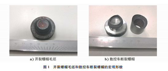 材料為45鋼,規(guī)格為22mm×30mm(外螺紋直 徑×長度),內(nèi)孔直徑為13mm 的某型螺帽,其加工 工藝為:下料→普車→車底孔→熱處理→數(shù)控車→攻 絲→表面處理等。根據(jù)排查結(jié)果發(fā)現(xiàn),熱處理工序后 共報廢了6個螺帽,并在現(xiàn)場發(fā)現(xiàn)1個開裂螺帽毛 坯,數(shù)控車過程中有2個螺帽發(fā)生斷裂。筆者對斷裂 螺帽進行了一系列理化檢驗,找出了螺帽斷裂的原 因,并提出了相關(guān)建議,以提升產(chǎn)品的質(zhì)量和安全性。