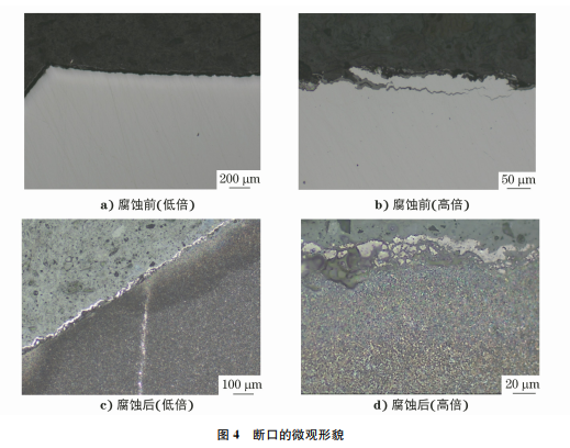 將數(shù)控車斷裂螺帽沿軸向切開,經(jīng)鑲嵌、磨制及 拋光后,用光學(xué)顯微鏡進行觀察,然后用4%(體積 分數(shù))硝酸乙醇溶液對試樣進行腐蝕,再用光學(xué)顯微 鏡進行觀察,結(jié)果如圖4可知。由圖4可知:斷口表 面存在氧化現(xiàn)象,深度約為0.07mm;非金屬夾雜物 主要為球狀氧化物,依據(jù)GB/T10561—2005《鋼中 非 金屬夾雜物含量的測定標(biāo)準(zhǔn)評級圖顯微檢驗法》,可評為D類細系0.5級,撕裂棱線處存在少量 二次裂紋,呈沿晶擴展形貌;斷口處未見脫碳現(xiàn)象, 顯微組織為回火索氏體,存在少量帶狀組織偏析現(xiàn) 象,依據(jù)GB/T13299—1991《鋼的顯微組織評定方 法》,可評為 A3C類2級,未見過熱、過燒等缺陷。