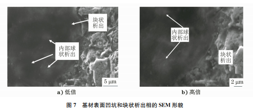 基材表面凹坑和塊狀析出相的SEM 形貌如圖 7所示,可見黑色塊狀析出相與球狀析出相(M23C6) 交替析出,形成共生狀態(tài)。