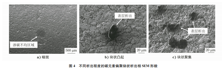 對(duì)不同析出程度的碳元素偏聚塊狀析出相進(jìn)行 SEM 觀察,結(jié)果如圖4所示。由圖4可知:在析出 初期時(shí),塊狀析出相以暗斑形式分布在球閥表面;隨 著滲碳時(shí)效處理的時(shí)間不斷延長,該處形成碳元素 偏聚,并在表面形成黑色塊狀凸起,甚至塊狀聚集形 貌[4],此時(shí)黑色塊狀析出相附近并未產(chǎn)生明顯的凹 坑形貌或其他析出相。