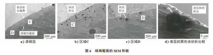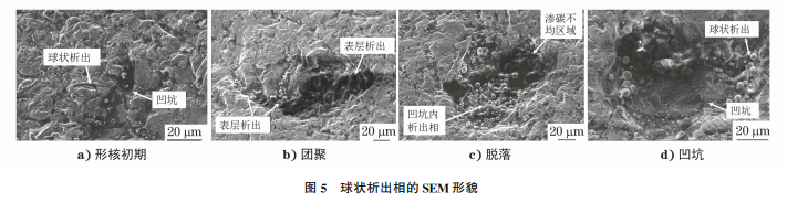 球閥表面部分析出相并未以塊狀凸起或聚集的 形式繼續(xù)長大,而是形成球狀析出相,其SEM 形貌如 圖5所示。由圖5可知:在形核初期,球狀析出相尺 寸較小,未形成團(tuán)聚,分布在塊狀析出相表面[5];隨著 滲碳熱處理工藝的進(jìn)行,塊狀析出相長大、聚集,且其 附近球狀析出相的尺寸開始增大,數(shù)量逐漸增多,并 形成團(tuán)聚效應(yīng)[6];隨著球狀析出相團(tuán)聚尺寸不斷增 大,該處基體開始產(chǎn)生凹陷,并伴有基體組織損失,球 狀析出相和塊狀析出相發(fā)生脫落[7];最終基體表面形 成凹坑,凹坑周邊伴有球狀析出相的形貌組織。