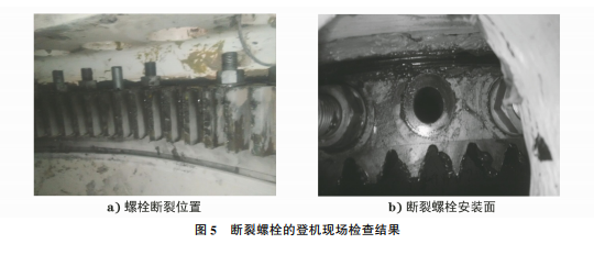登機現(xiàn)場檢查發(fā)現(xiàn)變槳軸承和斷裂螺栓安裝面 上有殘存的潤滑膏(見圖5),使螺栓預(yù)緊力變小,螺 栓局部受力不均,造成螺栓提前疲勞,甚至斷裂[7]。 同時發(fā)現(xiàn)部分螺栓有松動現(xiàn)象,螺栓緊固后,定位標 志線錯位超過20°,斷裂螺紋與 T型螺母表面可見 不同程度的摩擦光亮痕跡,表明運行過程中螺栓有 松動或滑動現(xiàn)象。螺栓松動或滑動后,其所受的交 變應(yīng)力增加,促使螺栓發(fā)生疲勞斷裂。