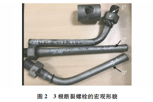 現(xiàn)場檢查發(fā)現(xiàn)3根葉片高強螺栓根部斷裂,其 中2根螺栓斷裂后卡在變槳齒圈與變槳電機齒輪之 間。葉片與輪轂采用雙頭螺栓連接,底端是橫向螺 母(T型螺母),隱埋在葉片根部內(nèi),外部吸附玻璃 鋼,頂端是六角螺母。葉片螺栓連接方式和安裝方 式如圖1所示[2]。3根斷裂螺栓的宏觀形貌如圖2 所示,可見2根螺栓均斷裂于T型螺母內(nèi)部。