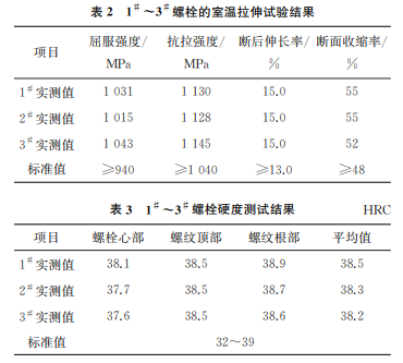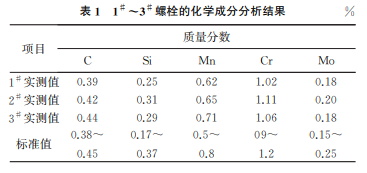 采用 OLYMPUS型直讀式光譜儀對1# ~3# 螺栓試樣進行化學(xué)成分分析,結(jié)果如表1所示,可知螺栓化學(xué)成分均符合GB/T3077—2015《合金結(jié)構(gòu) 鋼》的要求。