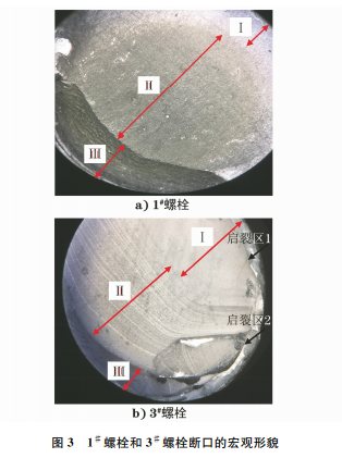 用LeicaA60H 型體式顯微鏡觀察1# 螺栓和 3# 螺栓斷口的宏觀形貌,結(jié)果如圖3所示。由圖 3a)可知:1# 螺栓斷口由裂紋源區(qū)(Ⅰ)、裂紋擴展區(qū) (Ⅱ)和最終瞬斷區(qū)(Ⅲ)組成,裂紋源位于螺栓外緣 應(yīng)力集中處,裂紋由邊緣向中心擴展,裂紋源區(qū)斷口 表面光滑,分析為工作應(yīng)力突然增大而導(dǎo)致裂紋萌 生;裂紋擴展區(qū)呈淺灰色,整個區(qū)域較為平整,隱約 可見疲勞貝紋線;裂紋瞬斷于螺栓橫截面1/5處,最 終瞬斷區(qū)與橫截面的夾角約為45°,斷面較粗糙,顏 色發(fā)暗[3-5]。