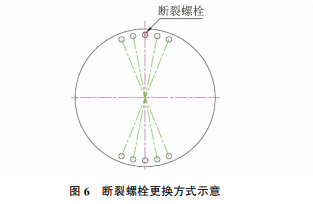 該風(fēng)電場螺栓的更換施工方案為,更換斷裂螺 栓和其左、右兩側(cè)各兩根螺栓,及該5根螺栓圓周對 角線對應(yīng)的5根螺栓,共計10根(見圖6)?,F(xiàn)場裝 配要求為:變槳軸承與墊圈接觸面不允許涂抹潤滑 膏,保證裝配質(zhì)量,避免影響螺栓預(yù)緊力的均勻性; 該機組葉片螺栓頻繁斷裂,聯(lián)系主機廠對該風(fēng)電場 風(fēng)機載荷重新校核計算,對應(yīng)葉片螺栓的裝配預(yù)緊 力需進行調(diào)整。