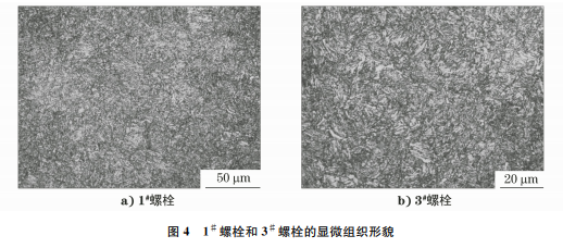 在1# 螺栓和3# 螺栓的橫向取樣,經(jīng)研磨、腐蝕 后用光學(xué)顯微鏡進行金相檢驗,結(jié)果如圖4所示,可 知1# 螺栓和3# 螺栓的顯微組織均為回火索氏體, 組織未見異常。
