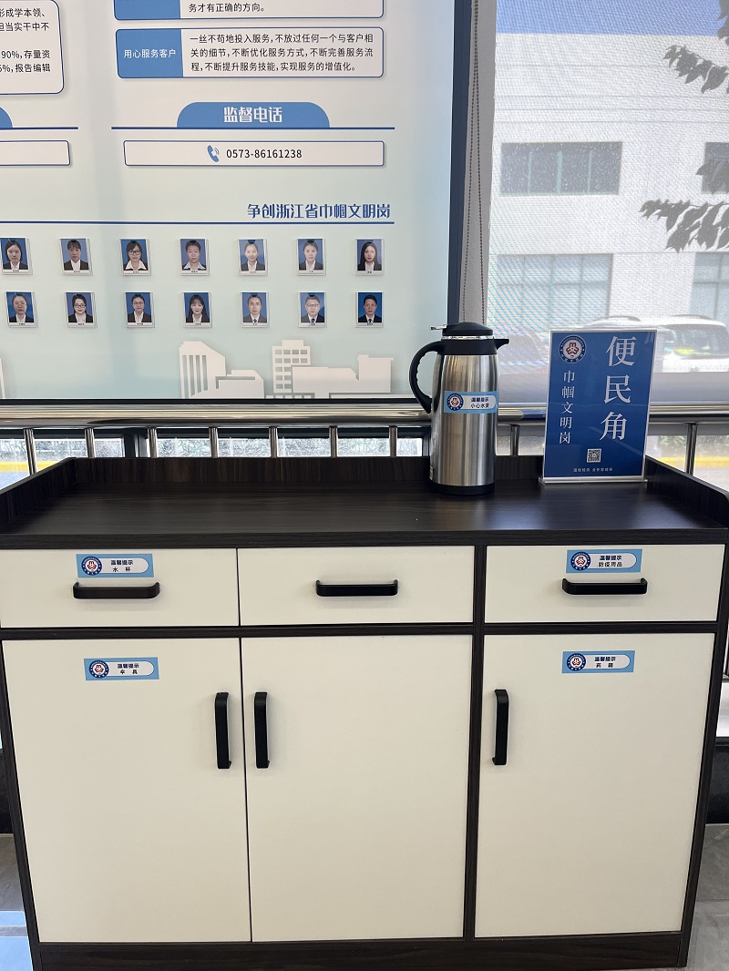 業(yè)務(wù)管理部以“國檢藍(lán)”主題為特色,增設(shè)了“巾幗便民角”,根據(jù)來檢客戶的不同需求,放置了水壺、水杯、防疫用品、藥箱、傘具等用品,大大方便了客戶的日常送檢工作;同時也優(yōu)化了受理大廳的整體環(huán)境,提升客戶在國檢的服務(wù)體驗。