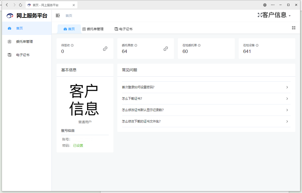 今年初,業(yè)務(wù)管理部配合公司校準(zhǔn)業(yè)務(wù)升級,上線“檢驗檢測智慧云”平臺,為客戶提供委托單管理、電子證書、設(shè)備管理等功能,并與“浙里檢”平臺對接,實現(xiàn)業(yè)務(wù)受理網(wǎng)頁端手機(jī)端全覆蓋,檢測校準(zhǔn)報告全面電子化。在響應(yīng)“數(shù)字浙江”號召的同時,提升服務(wù)質(zhì)效,優(yōu)化營商環(huán)境。