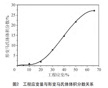 節(jié)鎳型奧氏體不銹鋼為典型亞穩(wěn)定奧氏體不銹鋼,塑性變形會使亞穩(wěn)定面心立方奧氏體轉(zhuǎn)變?yōu)榫哂需F磁性的體心立方馬氏體,形變馬氏體對不銹鋼性能有較大的影響。根據(jù)文獻[7]得知,節(jié)鎳型奧氏體不銹鋼形變馬氏體體積分數(shù)曲線如圖2所示。當(dāng)應(yīng)變量小于5%時,材料中無馬氏體相變產(chǎn)生;當(dāng)應(yīng)變量超過5%時,馬氏體含量隨應(yīng)變量的增加而增多;在應(yīng)變量小于20%時,不銹鋼產(chǎn)生少量的形變馬氏體;應(yīng)變量在20%~50%之間時,形變馬氏體隨應(yīng)變量的增加而急劇增加,幾乎呈線性關(guān)系;當(dāng)應(yīng)變量大于50%時,形變馬氏體含量仍有所增加,但是增加速率減小。形變誘導(dǎo)馬氏體體積分數(shù)增加,使加工硬化程度加劇,當(dāng)不銹鋼軋制過程總壓下率達到一定程度后,其所特有的時效裂紋就會發(fā)生裂紋擴展,裂紋擴展到一定程度將會導(dǎo)致斷帶。